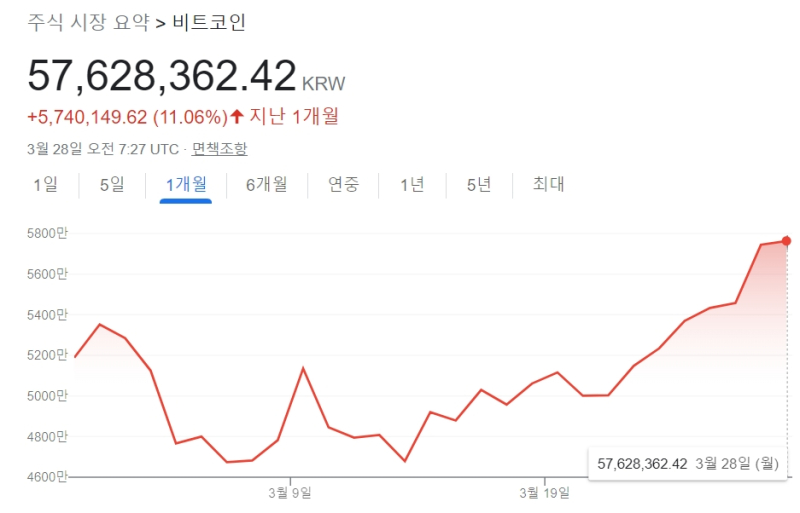 28일 오후 4시 30분 기준 1비트코인 가격은 5762만 8362원으로 최근 한 달 사이 11.06% 올랐다.