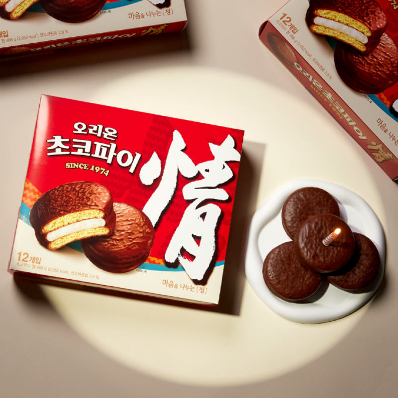 새롭게 리뉴얼된 패키지는 초코파이 고유의 디자인 아이덴티티는 유지하면서도 감각적인 색상과 전통적인 패턴을 더해 세련미를 입혔다. 반세기 동안 가족, 친구, 지인들과 함께 나눴던 초코파이의 정(情)을 지속 이어갈 수 있도록 ‘情’을 크게 새겼으며, 아래에는 ‘마음을 나누는 정(情)’이라는 문구도 삽입했다. 먹음직스럽게 잘린 초코파이를 감싸는 띠에는 과거 초코파이 패키지를 연상할 수 있는 파란색을 더했다.