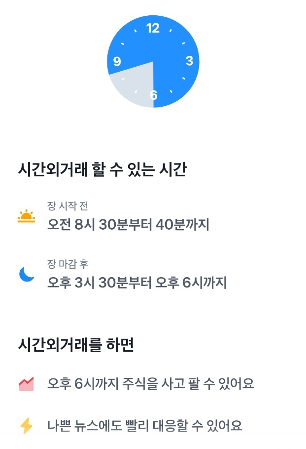 거래주문 접수는 3시 30분부터 가능하고, 접수해뒀던 주문은 40분부터 체결되기 시작한다. 정규장이 열렸을 때 매매 타이밍을 놓쳤다면 시간외종가 매매를 활용할 수 있다.
