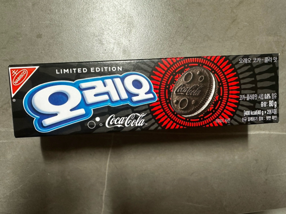 오레오 코카콜라맛의 패키지는 검정과 붉은 색의 조화로 단조롭지만 고급스러웠다. 코카콜라의 상징적인 색감과 오레오를 나타내는 푸른색의 조화가 잘 어우러졌다.