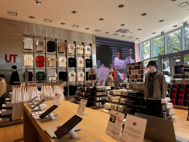 입구로 들어서면 가장 먼저 ▲커스터마이징 서비스 UTme!(유티미)각 눈에 들어온다. 다양한 프린팅이 새겨진 수많은 티셔츠가 벽 한 면을 모두 채우고 있는 것이 인상적이다. 이곳에서는 테블릿을 통해 800여 가지의 다양한 스티커로 나만의 옷을 직접 만들어볼 수 있다. 티셔츠 외에도 토트백도 만들 수 있으며 특정 매장에서는 한정판 스티커도 제공된다.