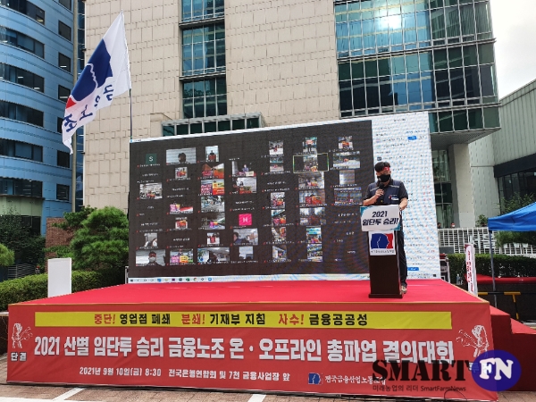 금융노조는 10일 오전, 서울 중구 전국은행연합회 앞에서 총파업 결의대회를 열고 임금인상과 법정휴게시간 보장 등을 촉구했다.