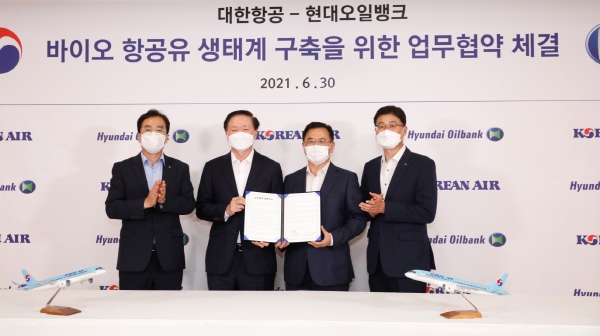 현대오일뱅크와 대한항공은 30일 서울 강서구 대한항공 본사에서 ‘바이오항공유 제조 및 사용 기반 조성 협력을 위한 양해각서’를 체결했다. 체결식에는 강달호 현대오일뱅크 사장, 우기홍 대한항공 사장 등이 참석했다.
