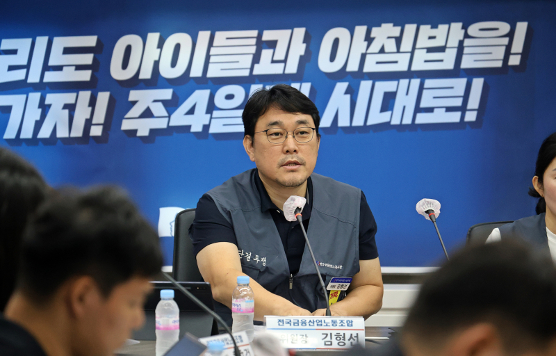 김형선 금융노조 위원장은 "금융노조는 20년 전 주 5일제를 최초 도입한 산별 노조"라며 "주4일제의 포문도 금융노조가 열겠다"고 말했다.