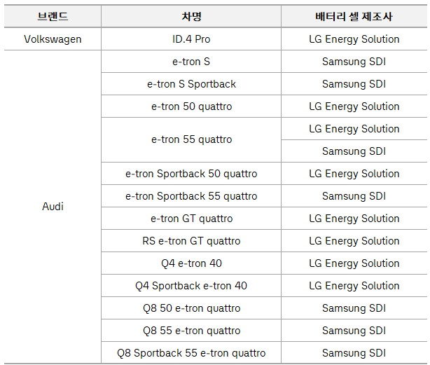 e-트론 50 콰트로(스포트백 포함), e-트론 GT 콰트로, RS e-트론 GT 콰트로에는 LG에너지솔루션 배터리가 적용됐다. 또 다른 전기 SUV인 Q4 e-트론(스포트백 포함)의 배터리도 모두 LG에너지솔루션 제품이었다.