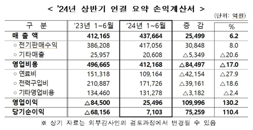 한전은 상반기 실적에 대해 요금 조정 등으로 매출액이 전년 동기 대비 2조5천499억원 증가했고 연료비와 전력구입비 감소로 영업비용이 8조4천497억원 줄어든 영향이 컸다고 설명했다.