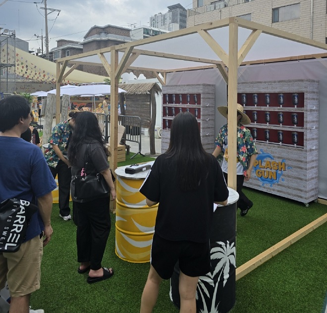 좀 더 안으로 들어가니 '물총 슈팅 게임'이 준비돼 있었다. 이 '플래쉬 건' 존에서는 여름이라는 콘셉트에 맞게 물총으로 과녁을 쏴 넘어트리면 된다. 이 과녁은 게임 내 에너지 드링크로 구성돼 있었다.