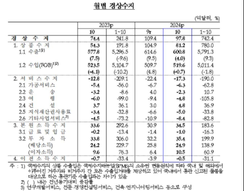 1월부터 10월까지의 누적 경상수지는 742억4000만달러 흑자로 같은해 같은 기간 241억8000만달러보다 500억6000만달러나 늘었다.