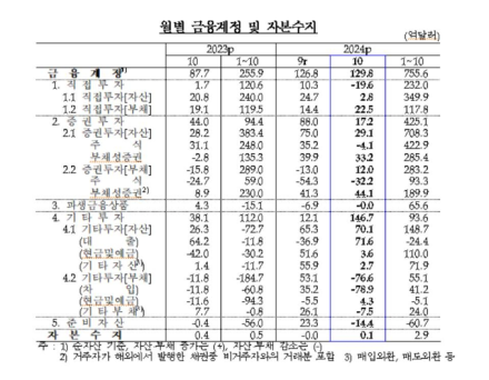 서비스 수지 가운데 여행수지는 4억8000만달러 적자였다. 중국 국경절 연휴 등의 영향으로 여행 수입이 늘어 적자가 9월(-9억4000만달러)보다 줄었다. 운송수지는 컨테이너선 운임 하락 등에 9월 4억달러 흑자에서 10월 2억3000만달러 적자로 돌아섰다.