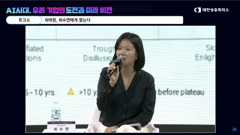 최수연 대표는 ‘AI 시대, 우리 기업의 도전과 미래 비전’을 주제로 진행된 최태원 대한상의 회장, 정송 카이스트 김재철AI대학원 원장과의 대담에서 "한국은 우수한 AI 산업 생태계와 독자적인 디지털 플랫폼을 보유한 국가로 글로벌에서 AI 선도 국가로 인정받고 있다"고 말했다.