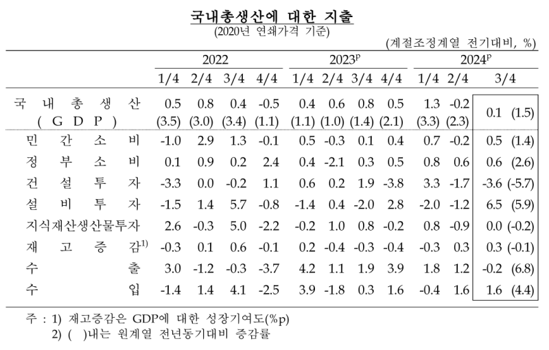 분기 성장률은 지난해 1분기부터 올해 1분기까지 성장세였지만, 1분기 1.3% 성장률의 기저 효과 등으로 인해 2분기에 -0.2% 역성장한 바 있다.