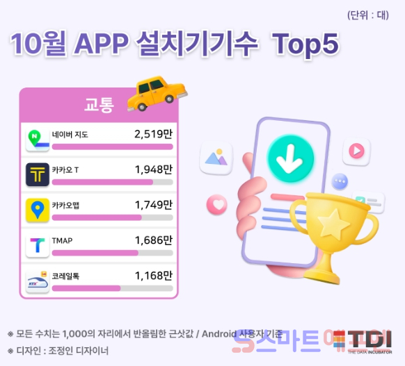 이동 관련 앱 설치 수 톱5…네이버 지도·카카오T·카카오맵·TMAP·코레일톡 순