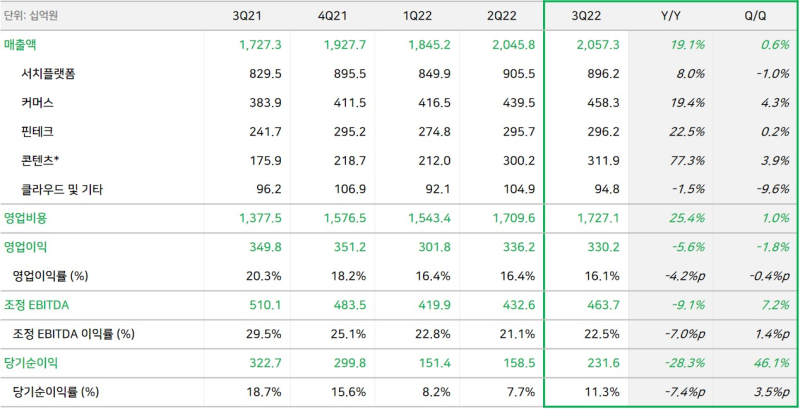 네이버의 3분기 매출은 콘텐츠와 커머스 등 사업의 급성장에 기인한다. 네이버가 3분기에 매출 2조원을 넘긴 것은 2021년 라인이 소프트뱅크와 경영 통합 이후 처음으로, 이번이 분기 사상 최대 매출 기록이다.