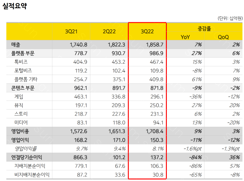 카카오의 2022년 3분기 플랫폼 부문 매출은 지난 분기 대비 6%, 지난해 동기 대비 27% 증가한 9869억원으로 집계됐다.