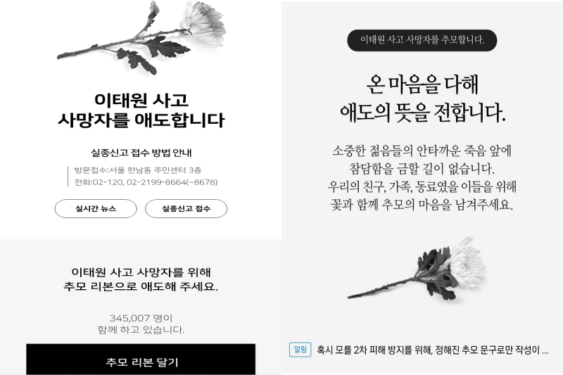 추모 게시판에는 흑백 국화 이미지와 함께 '이태원 사고 사망자를 애도합니다'라는 문구, 사고 사망자를 위해 추모 리본으로 애도해 달라는 메시지가 표시된다. '추모 리본 달기'를 누르는 방식으로 추모에 참여할 수 있으며, 별도의 댓글 작성 기능은 지원하지 않는다. 화면 아래에는 검은 리본과 추모한 이용자의 아이디 일부가 나타난다. 지난 30일 늦은 오후 시작된 네이버 앱 온라인 추모에는 오후 1시40분 현재 약 36만명이 참여하고 있으며, 숫자가 증가하고 있다.