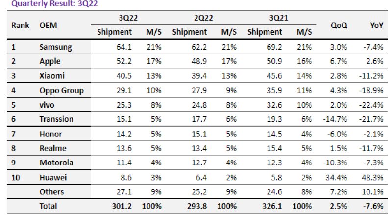 전세계 상위 5개 스마트폰 기업은 삼성전자, 애플, 샤오미, 오포, 비보 등이였다. 이 기간 동안 삼성전자 출하량은 전년 동기 보다는 8% 감소했다. 애플은 전년 보다 2% 증가했다. 샤오미, 오포, 비보 출하량도 각각 전년 대비 9%, 23%, 23% 줄었다.