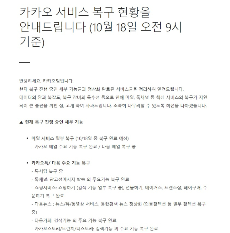 이와 관련해 카카오 관계자는 "데이터의 양과 복잡도, 복구 장비의 특수성 등으로 인해 메일, 톡채널 등 핵심 서비스의 복구가 지연돼 큰 불편을 끼친 점, 고개 숙여 사과드린다"며 "조속히 마무리할 수 있도록 최선을 다하겠다"고 강조했다.