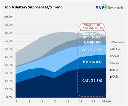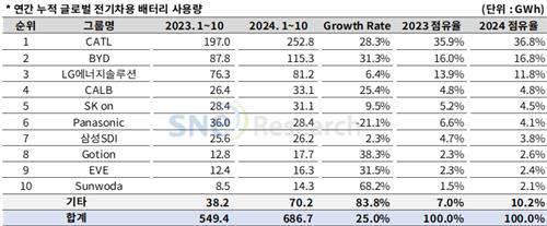 중국 CATL은 이 기간 28.3% 성장한 252.8GWh를 기록하며 점유율 36.8%를 장악하고 글로벌 1위 자리를 유지했다.