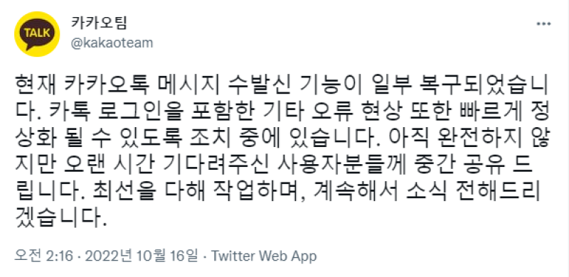 16일 카카오에 따르면 카카오톡은 이날 오전 1시 31분쯤 모바일 버전에서 텍스트 메시지 수·발신 기능이 일부 복구됐다.