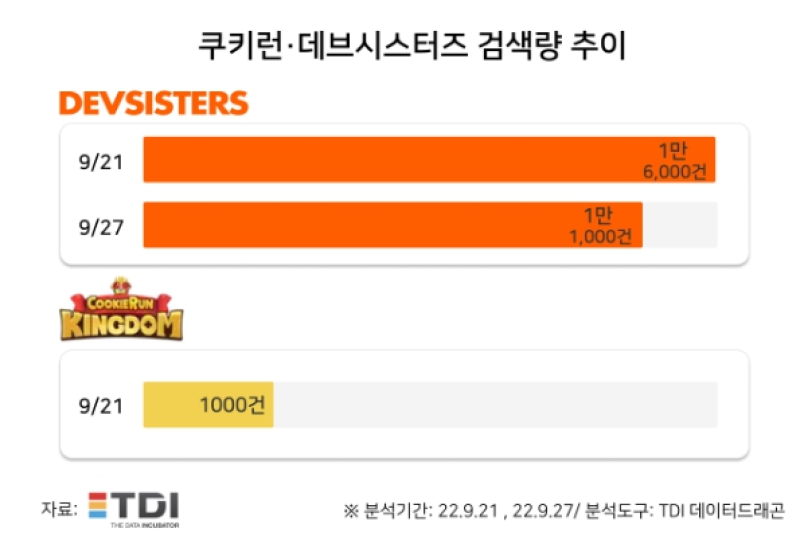 쿠키런: 킹덤 개발사인 ‘데브시스터즈’ 지난달 21일 검색량은 BTS와 콜라보 예고에 1만 6,000건으로 상승했다. 주식시장에서 게임주 중 주가 상승률이 높았던 지난달 27일 검색량은 1만 2,000건으로 상승했다.