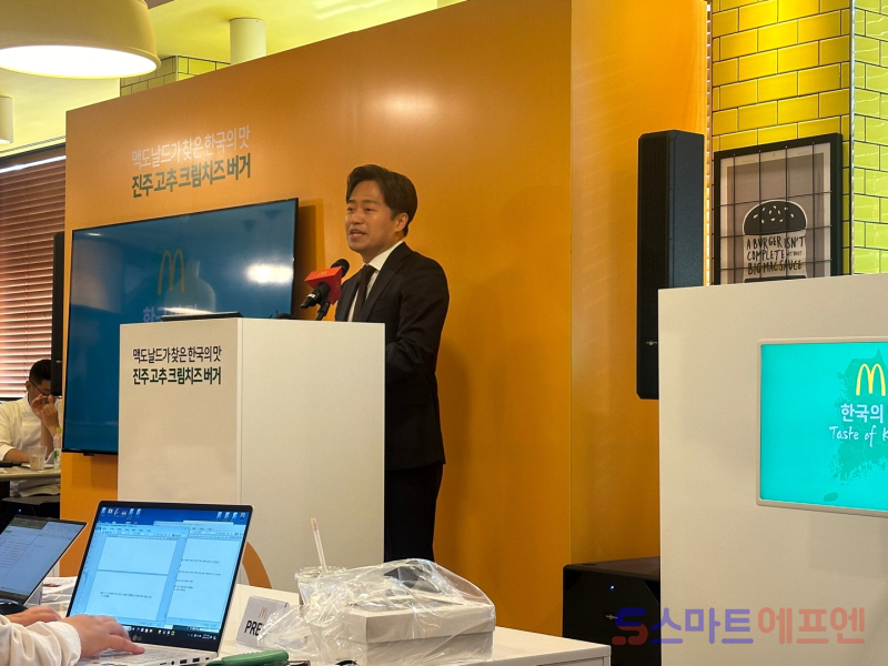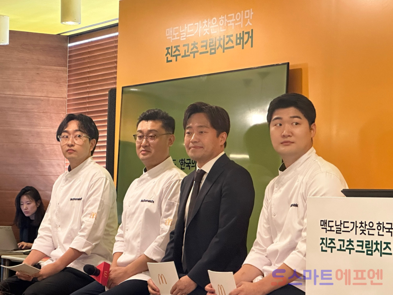 맥도날드는 11일 ▲진주 고추 크림치즈 버거, ▲진주 고추 크림치즈 머핀, ▲영동 샤인 머스캣 맥피즈 3종을 출시를 기념해 지난 10일 신제품 출시기념 미디어데이를 진행했다. 이날 행사장에는 양형근 한국맥도날드 대회협력 담당 이사와 한국맥도날드 메뉴팀 백창호 팀장, 이충희 컨설턴트, 홍주호 컨설턴트가 참석해 발표를 진행했다.