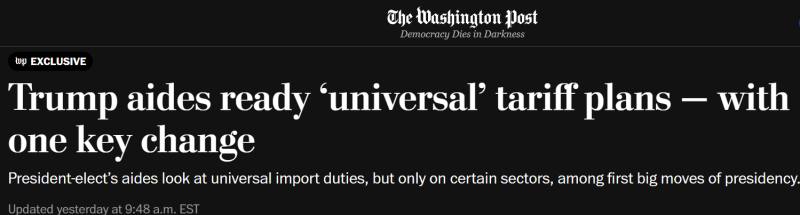 환율은 미국 트럼프 행정부가 보편 관세 공약을 일부 변경할 수 있다는 보도의 영향으로 하락했을 수 있다는 의견이 나오고 있다. 미국의 워싱턴포스트는 6일(현지시각) 트럼프 당선인이 보편관세 공약을 일부 핵심 품목에만 적용하는 방안을 검토하고 있다고 보도했다.