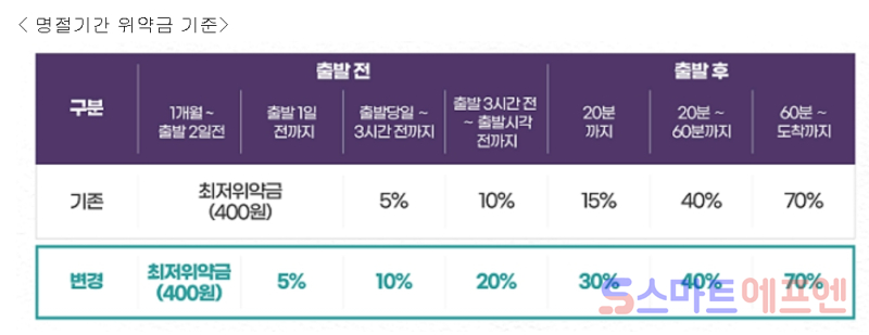출발 당일에는 환불 시점에 따른 위약금 부과 기준을 평상시 대비 2배 강화해 ▲출발 3시간 전까지 5% → 10% ▲출발 3시간 전~출발시각 전까지 10% → 20% ▲출발 후 20분까지 15% → 30%로 강화된다.