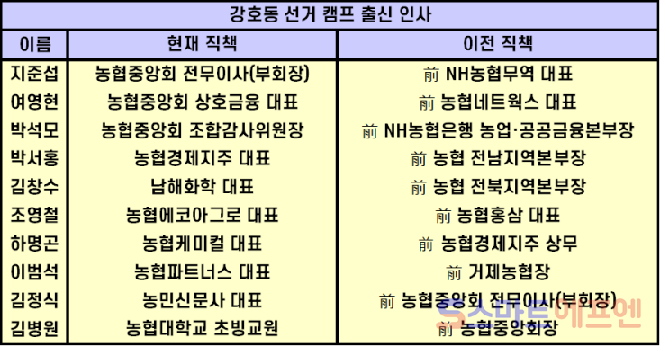당시 농해수위 소속 박덕흠 국민의힘 의원은 농협중앙회와 그 계열사의 핵심 인물들을 언급하며 "언론 보도를 보면 강호동 선거 캠프가 재취업 창구란 얘기가 나온다"고 지적했다. 이에 강 회장은 언급된 인물들에 대해 "선거 기간에 마음을 나눈 분들이고, 선거 때 음으로 양으로 날 도와줬다"고 말했다.